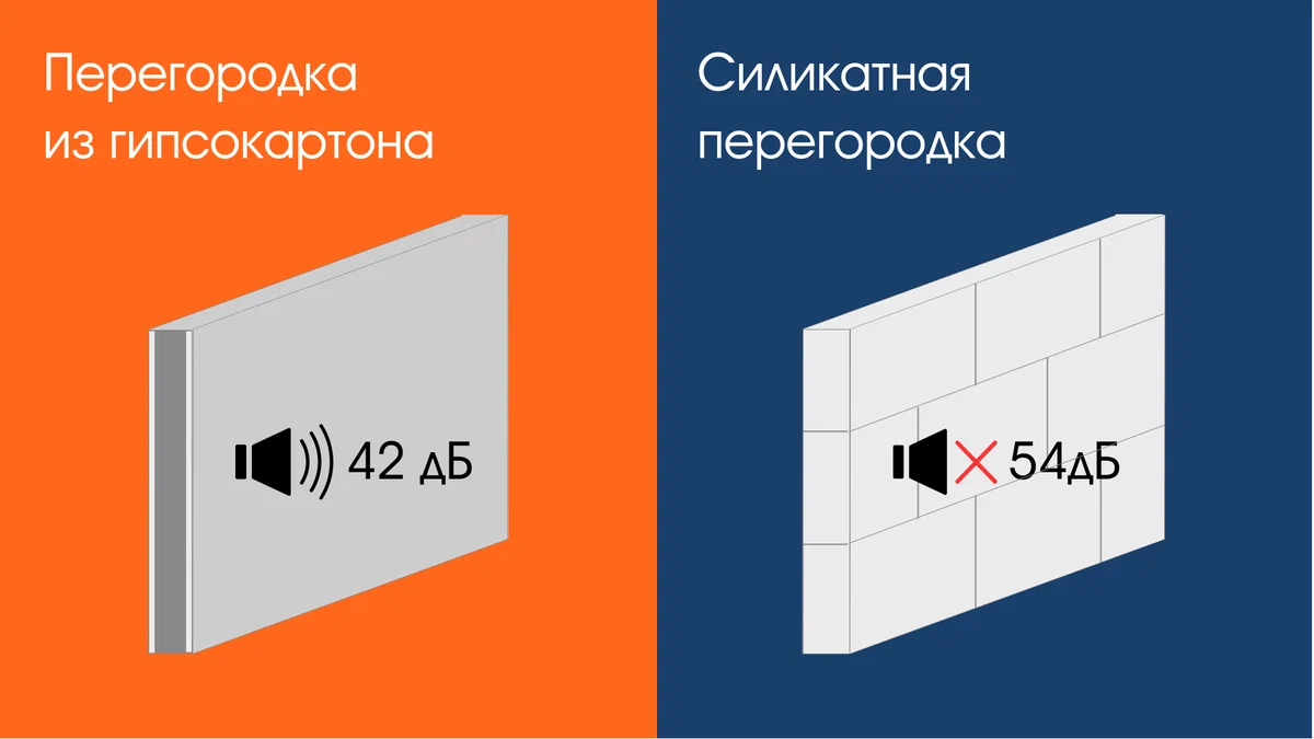 • Минимальная толщина с учетом нужного индекса звукоизоляции — 200 мм, что еще больше, чем кирпич, уменьшает полезную площадь помещения