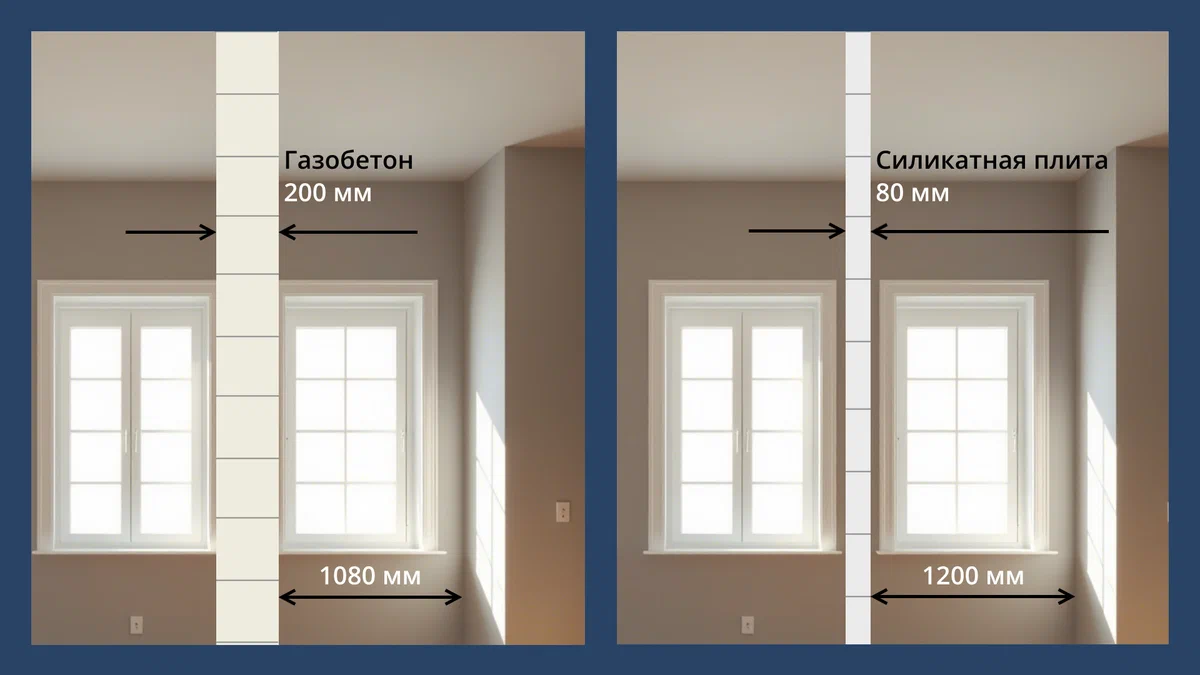 Давайте посмотрим, сколько дополнительного пространства можно получить, выбрав силикатную перегородку вместо других материалов: