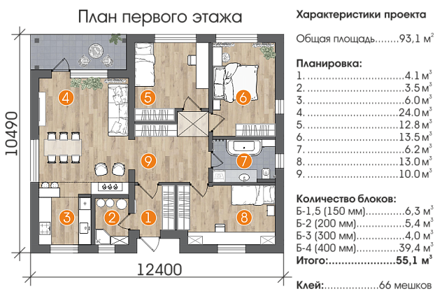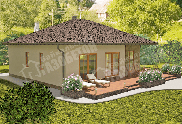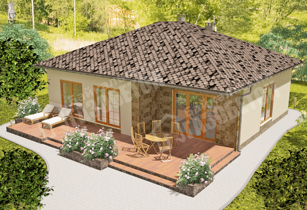 Одноэтажный дом с интересной планировкой. Рассчитан на большую семью с детьми, три спальных комнаты, гостиная, объединенная с кухней. Из гостиной предусмотрен выход на террасу.